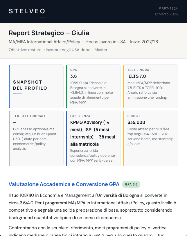 I voti italiani non si traducono direttamente nel sistema americano. Le esperienze professionali italiane vengono lette diversamente. I tempi del sistema italiano non coincidono con le deadline USA. Stelveo colma questo gap.